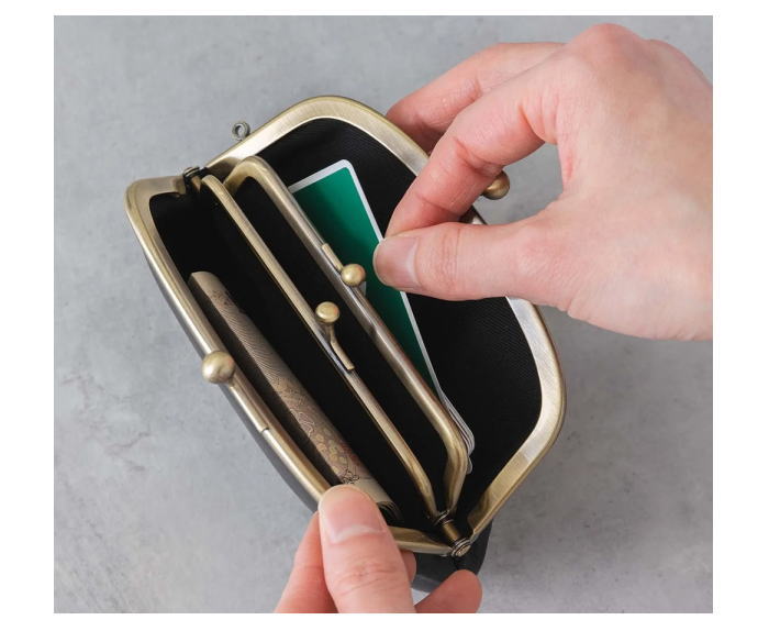 いサイズ感で、かたちも愛らしい財布です。中を開けると小さながま口があり