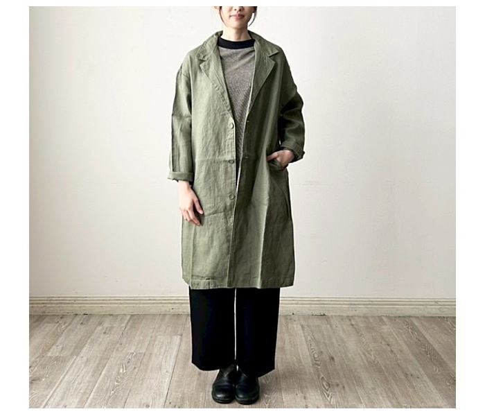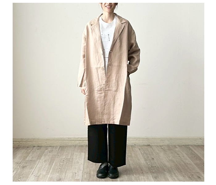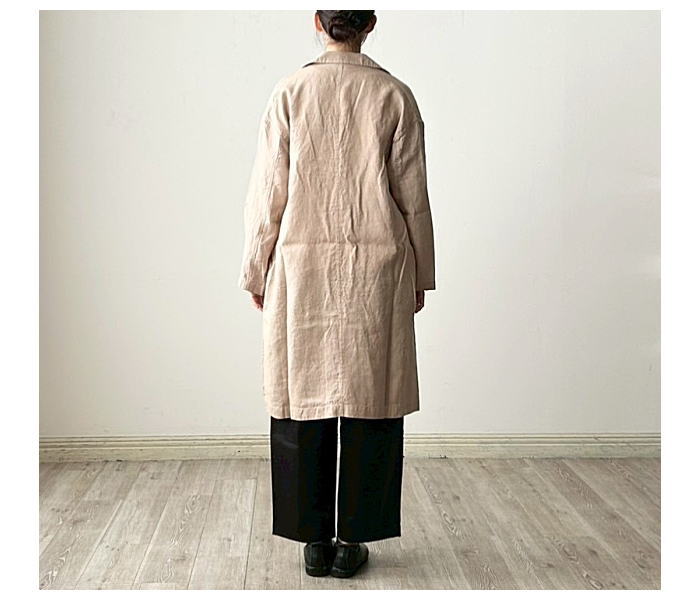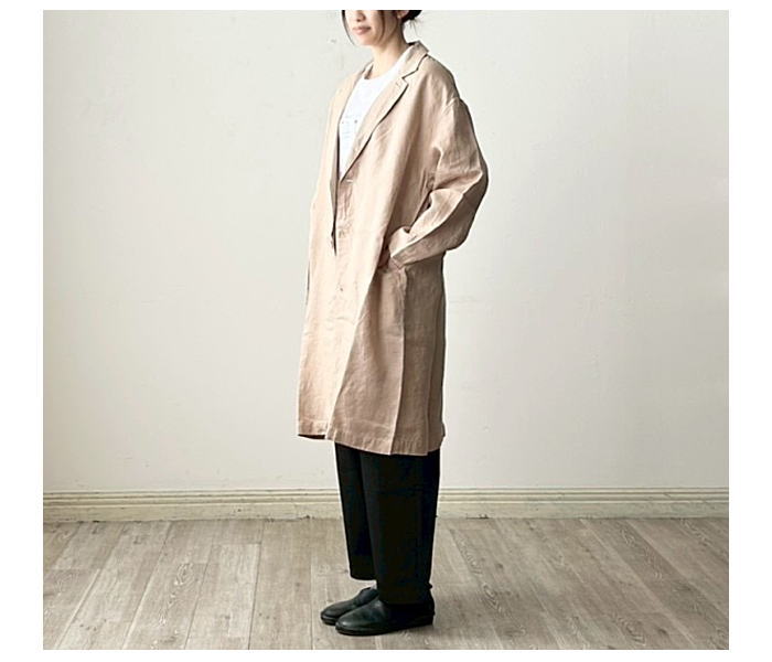 普通地のリネンで仕立てた軽やかなコート。すべてのボタンを留めるとス
