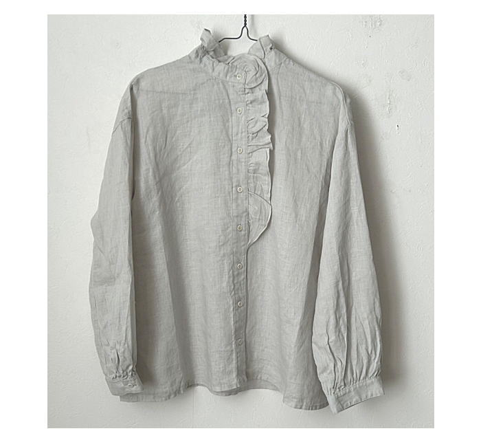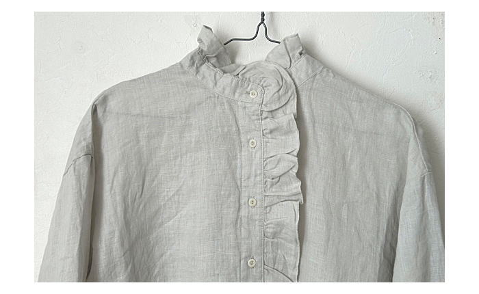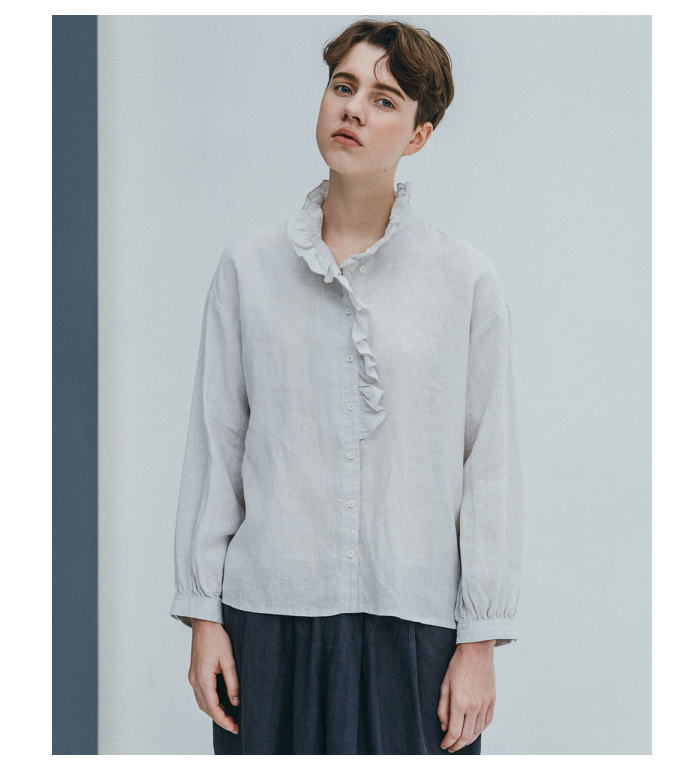 襟元と前立てに沿って贅沢にあしらったフリルが印象的なブラウスです。フ
