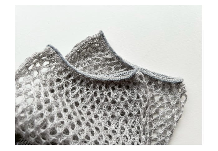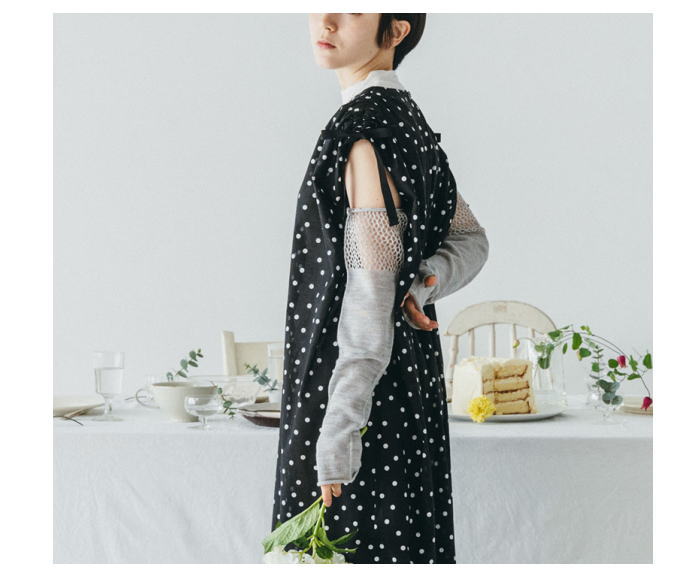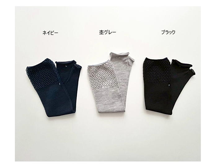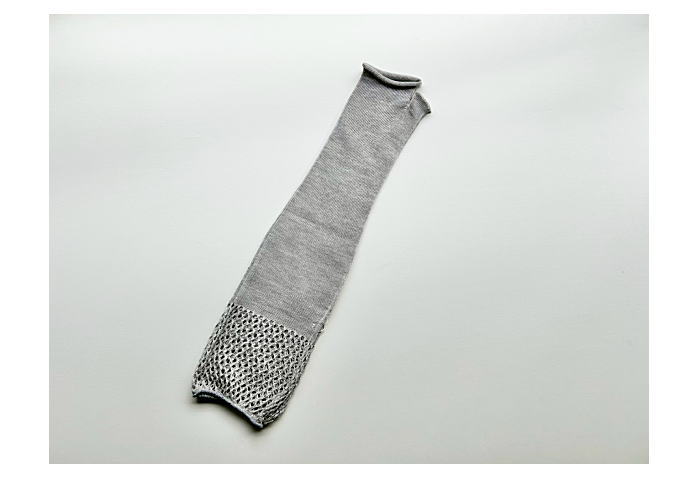 先にレース編みのような編柄を施したアームカバー。シャリ感のあるリネ