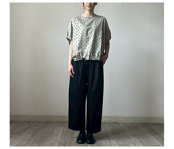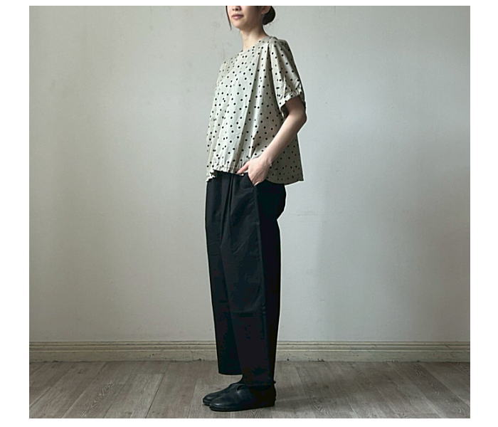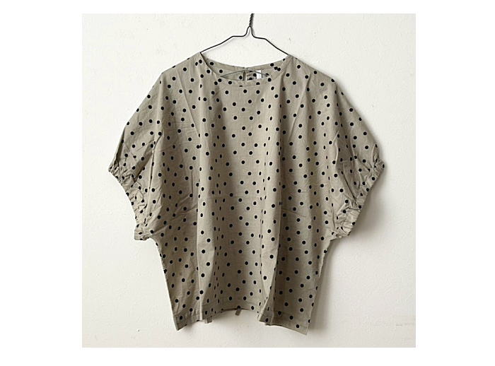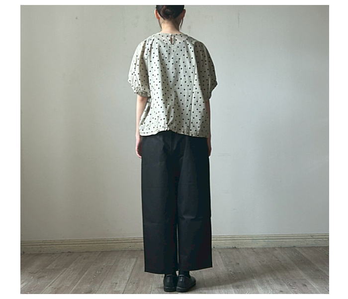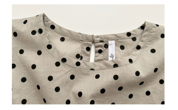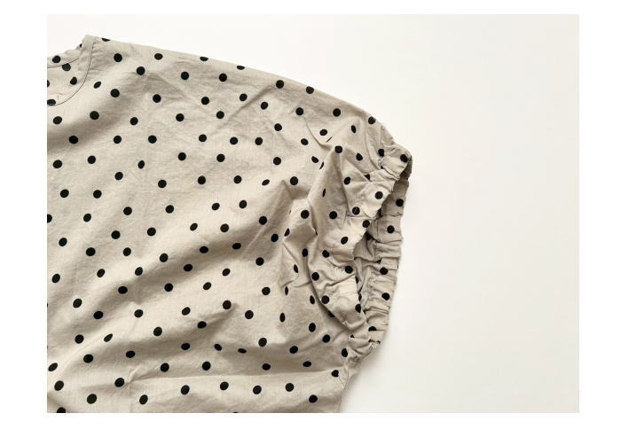 薄手のコットンローン生地にドット柄がプリントされた一着。たっぷりと身