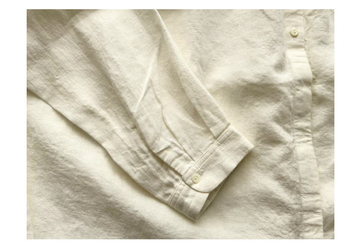 りとしているバンドカラーと下半分が比翼になったフロントボタン。カジュアル