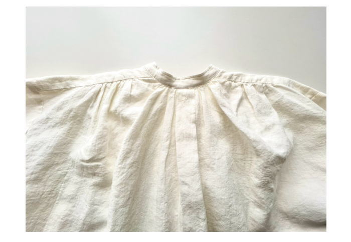 に施されたタックが生地に奥行きと立体感を与えます。デザインは首元はすっき