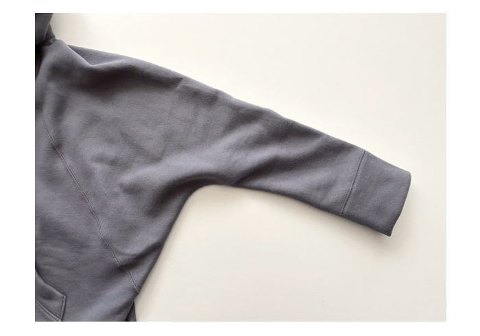パーカーです。肩まわりから袖口にかけてゆったりとしたドルマンスリーブは、