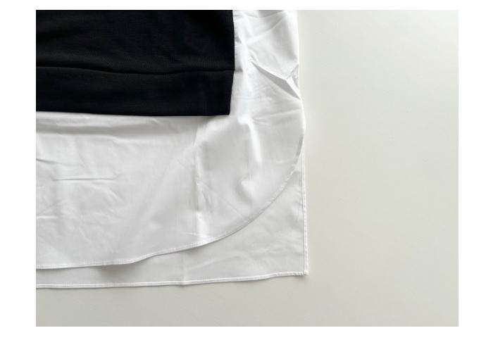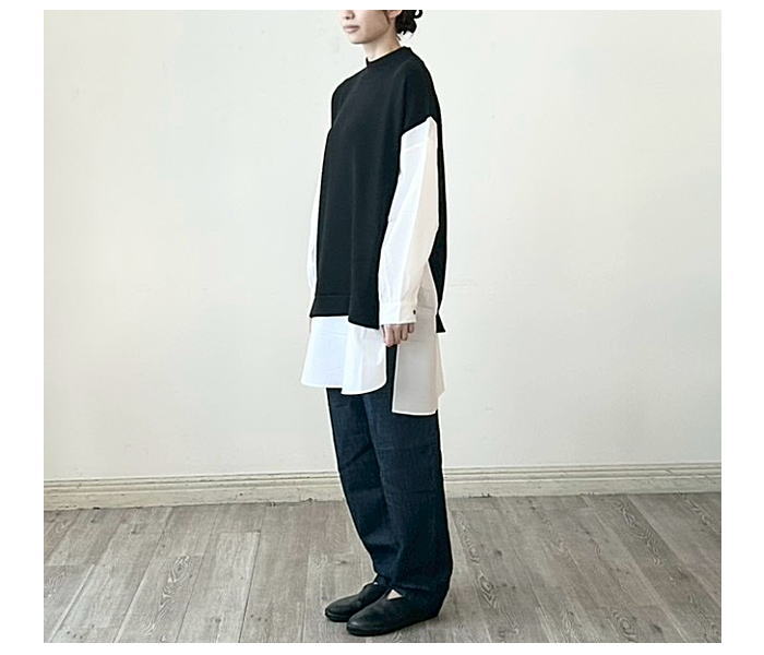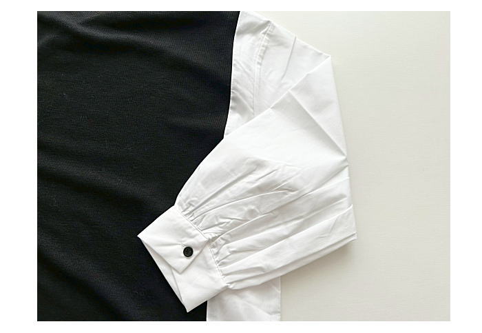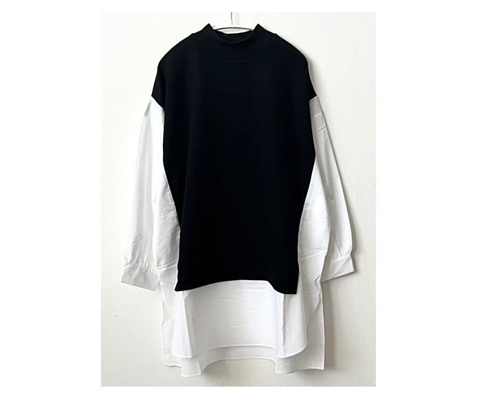 ソリッドな印象のニットとTR素材をコンビで配色したプルオーバートップ