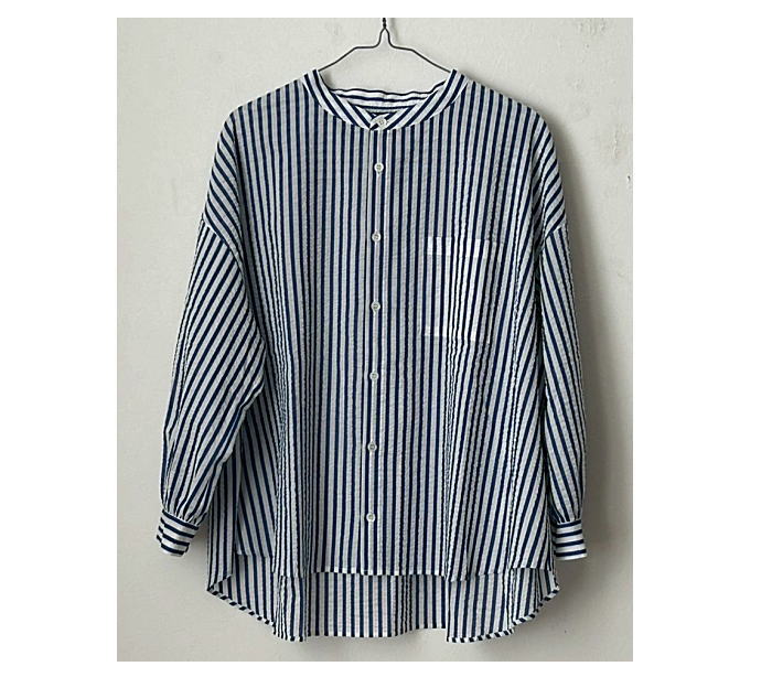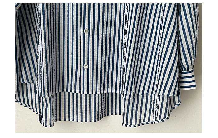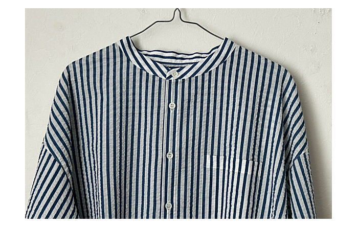 ちにくくアイロンなしでサマになります。ストライプブルー色が塩縮加工のポコ