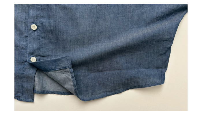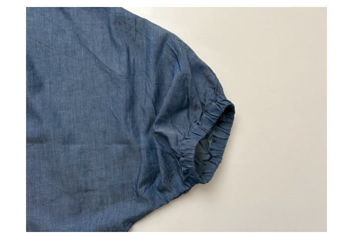 軽さのデニムシャツ。これからの季節に最適です。首元は甘くなりすぎない控え