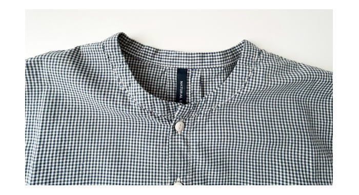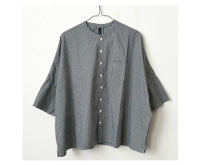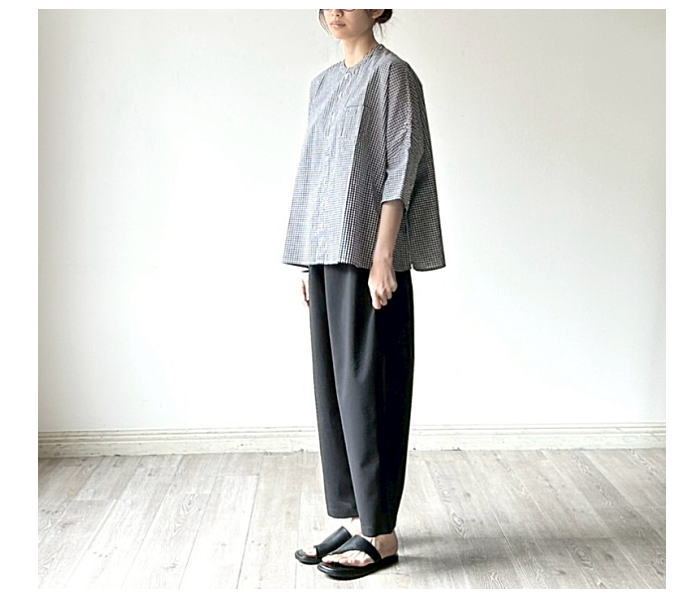 げられた一枚です。首元はスッキリとしたバンドカラー。身幅をたっぷりと取
