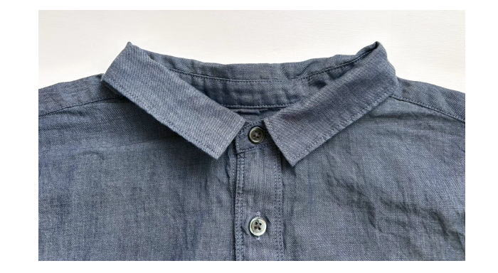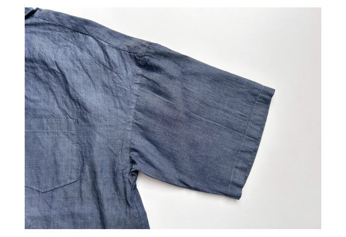 薄手で光沢感のある生地を使用した5分袖シャツ。光にかざすとわずかに透け感