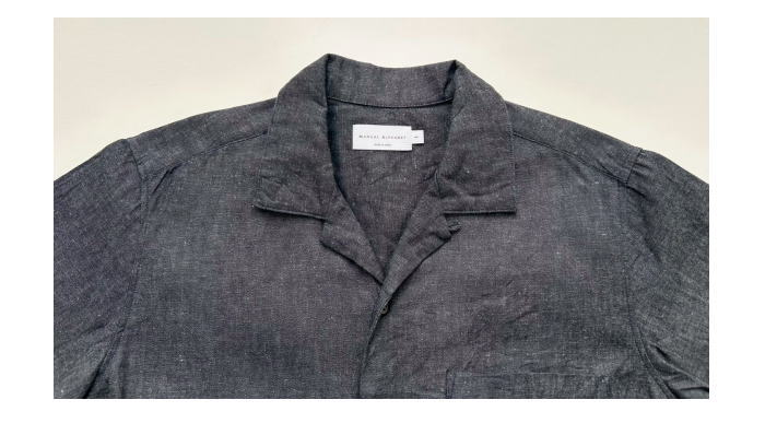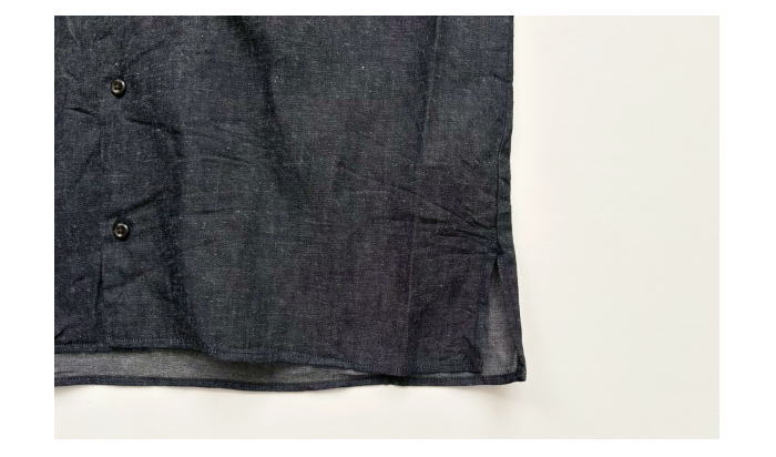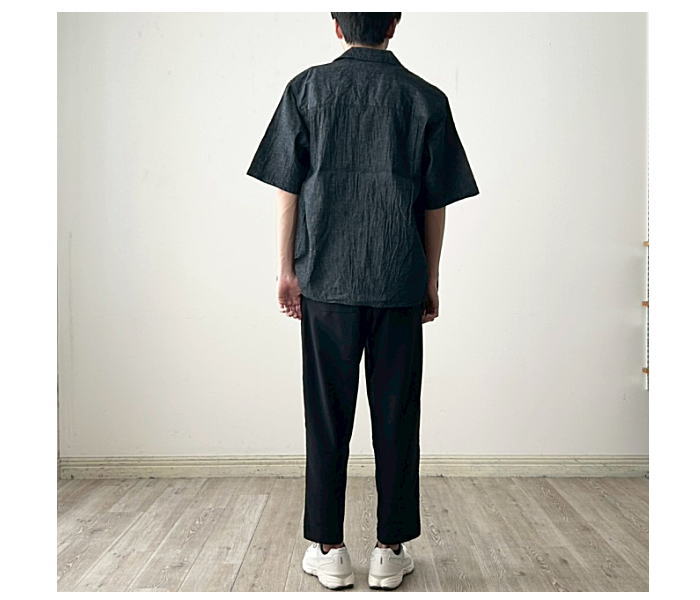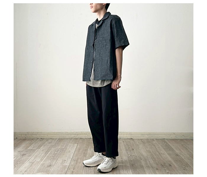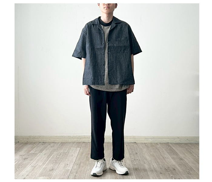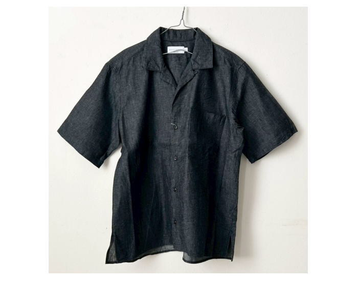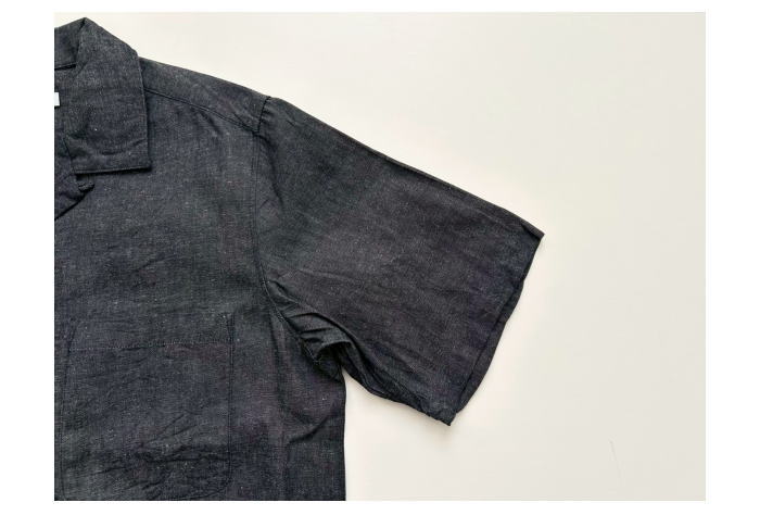 6ozの綿麻デニム素材を使用した半袖オープンカラーシャツ。肩幅・身幅にゆと