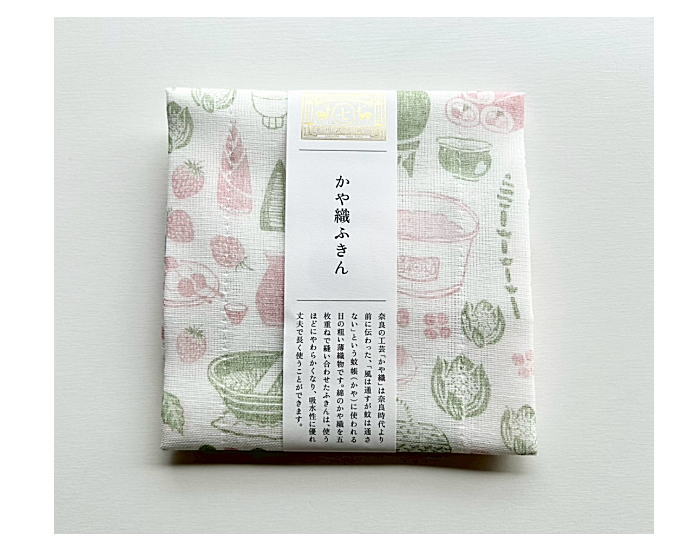 を散りばめ、にぎやかにデザインしました。綿のかや織を五枚重ねで縫い合わせたふきんは、