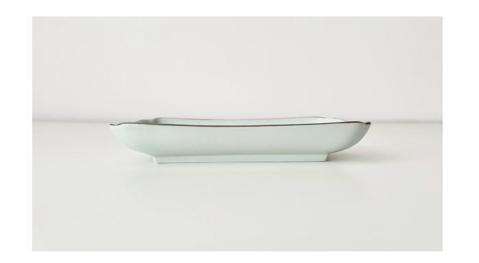 長崎県の白岳窯で作られている木瓜角皿。天草陶石に土灰釉を使用し、うっすらとした青